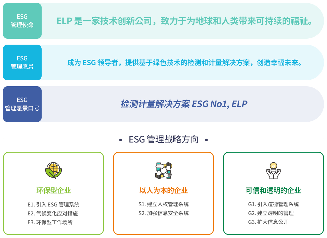 ELP 的目标是成长为 ESG 领域的一流公司,通过基于绿色技术的检测计量解决方案引领可持续发展的未来。